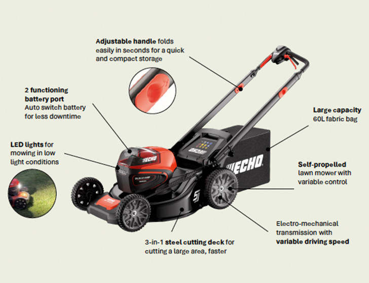 Zažijte výkon srovnatelný s benzínovými sekačkami díky první sekačce kompatibilní s bateriovou platformou ECHO 56V eFORCE™. Tato 3v1 samohybná sekačka, navržená pro náročné uživatele, nabízí funkce sečení, mulčování a sběru, což z ní činí ideální nástroj pro údržbu středních až velkých zahrad. Je vybavena výkonným bezkartáčovým motorem, automatickým ovládáním rychlosti a centrálním nastavením výšky v 7 pozicích, takže si snadno poradí i s náročným terénem. Funkce jako dvojitý bateriový port pro prodlouženou výdrž, velká zadní kola pro lepší manévrovatelnost a možnost vertikálního skladování zajišťují efektivitu a pohodlí při používání. Navíc LED světla umožňují práci i při zhoršených světelných podmínkách a polstrovaná, symetrická rukojeť poskytuje pohodlí v úzkých prostorech.