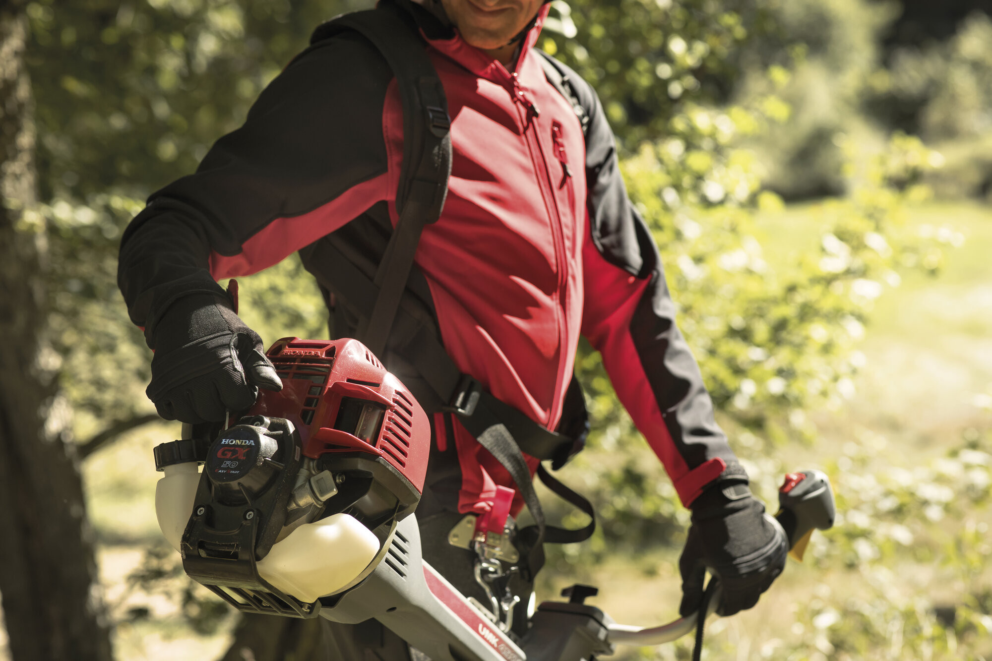 - Komfortní rukojeti - Rukojeti jsou mnohdy opomíjenou součástí stroje. U Hondy se tvarování, velikosti a materiálu rukojetí věnuje velká pozornost. Bezpečnost při manipulaci se strojem, jako je křovinořez je na úrvním místě. Proto i bezpečný úchop a držení je velmi důležitý. Ale i na komfort obsluhy se nezapomíná. Rukojeti jsou jedinými styčnými body obsluhy se strojem. Proto byla věnována velká pozornost přenosu nežádoucích vibrací na ruce obsluhy. Povrch rukojeti je v místě úchopu potažen měkčenou gumou, která pohlcuje velkou část vibrací od pracujícího stroje. Znatelně se tak snižuje únava obsluhy při dlouhodobé práci se strojem