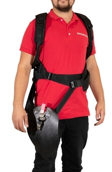 - Profesionální zádový nosný postroj - Tento profesionální dvouramenní zádový nosný postroj lze pro optimální nastavení pohodlně nastavit na velikost postavy každého uživatele. Mimořádně bohaté polstrování ramenních popruhů je příjemné pro každou postavu a důmyslné rozložení hmotnosti na bedra obsluhy, pohlcují velkou míru vibrací a poskytují, na trhu jedinečnou, míru komfortu tak, aby obsluha ani při dlouhodobé práci netrpěla únavou. Ochranný kryt chrání bok uživatele od přímého kontaktu s hřídelí křovinořezu a s bezpečnostním závěsem s uvolňovacím systémem.