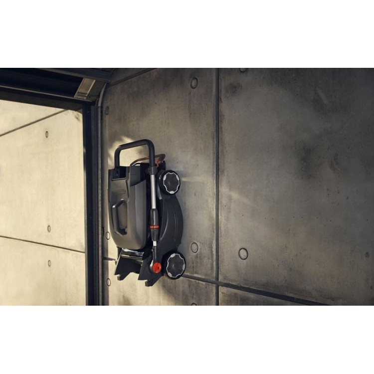 - Vertikální uložení - Jednoduše složte rukojeť, abyste minimalizovali prostor pro skladování a přepravu. Skladujte výrobek na stěně/kolejnici nebo svisle na podlaze. Sběrný koš na trávu lze na stroji přehledně uložit