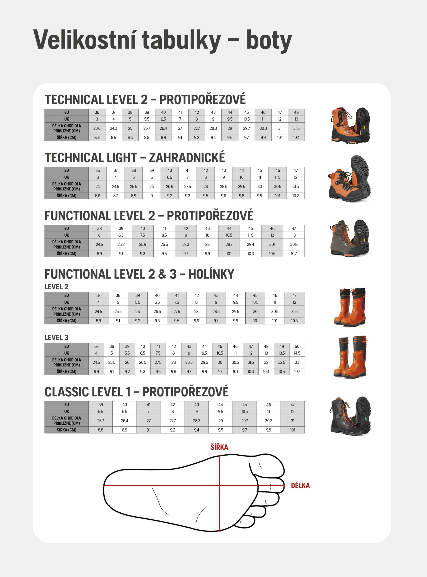 Robustní, přesto lehké a pohodlné boty, ideální pro příležitostné outdoorové aktivity. Vyrobeny z kůže, uvnitř zesílené mikrovlákno a podšívka z polyesterové síťoviny. Polstrovaný přední jazyk poskytuje podporu a vyšší pohodlí. Zesílené přední část a oblast paty zaručují vyšší odolnost proti opotřebení a zajišťují skvělou stabilitu pro kotníky a chodidla. Boty se snadno obouvají díky zadnímu poutku. Rychloupínací háčky usnadňují utažení a uvolnění tkaniček. Vyjímatelné stélky jsou omyvatelné. Nejedná se o obuv pro každodenní nošení, ale pro příležitostnou ochranu nohou při práci s řetězovou pilou s ochranou proti proříznutí. Obuv splňuje EN 17249: 2013 úroveň třídy 1 (20 m/s).