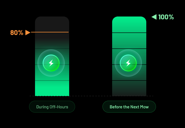- Jakmile baterie dosáhne kapacitu nižší jak 15 %, robotická sekačka LUBA mini 2 1000 se automaticky vrátí do nabíjecí základny a dobije baterii. Po nabití baterie pokračuje v sečení trávy od místa, kde bylo sečení přerušeno.