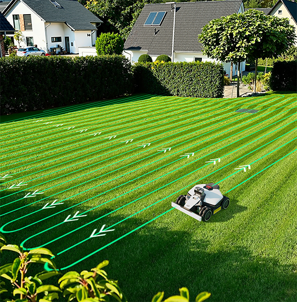 - DropMow - V režimu DropMow není potřeba žádné mapování – stačí sekačku položit, stisknout tlačítka „Mow & Start“ a sekačka začne sekat v pravidelném vzoru tvaru písmene N ve směru, kterým právě stojí. Dočasně vytvořená mapa se neukládá, což je ideální pro rychlé a jednorázové sečení.