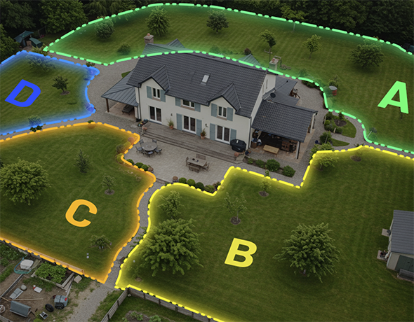 - Nastavení až 20 sečících oblastí pro různé části zahrady
