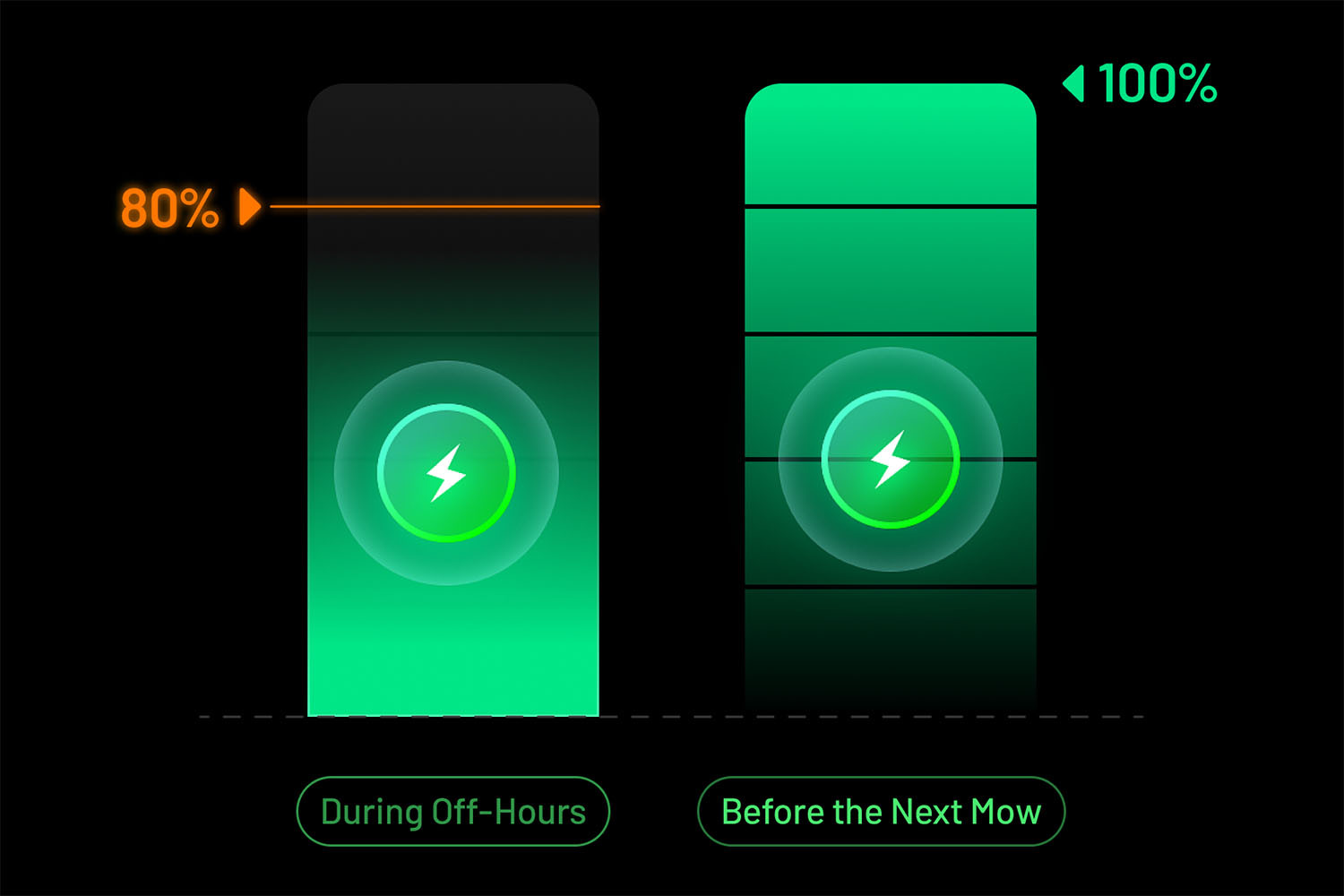 - Jakmile baterie dosáhne kapacitu nižší jak 15 %, robotická sekačka YUKA mini 2 1000 se automaticky vrátí do nabíjecí základny a dobije baterii. Po nabití baterie pokračuje v sečení trávy od místa, kde bylo sečení přerušeno.