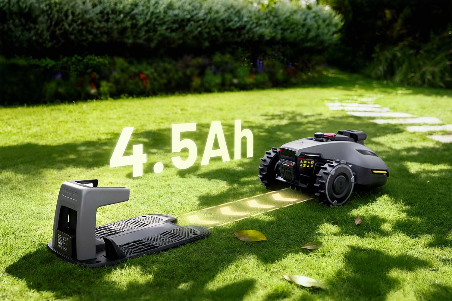 - Jakmile baterie dosáhne kapacitu nižší jak 15 %, robotická sekačka YUKA mini 2 800 se automaticky vrátí do nabíjecí základny a dobije baterii. Po nabití baterie pokračuje v sečení trávy od místa, kde bylo sečení přerušeno.